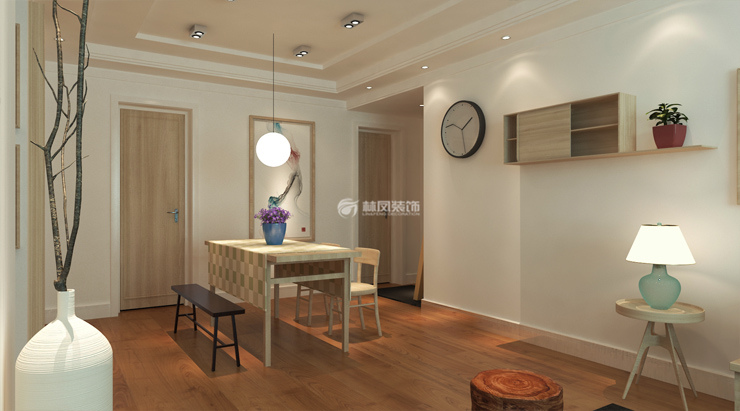 客廳與餐廳同寬,格局很好??蛷d沒有做過多的裝飾,以白墻為主,陶瓶+干枝,還有懸掛式的電視柜下方的燈光,使背景墻達到日式的禪意效果。