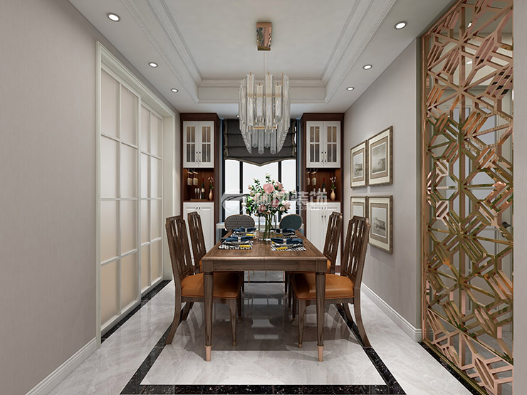 中??党?30平3居室美式風(fēng)格林鳳裝飾的餐廳部分,在餐廳左側(cè)設(shè)計(jì)了兩個(gè)實(shí)木高酒柜設(shè)計(jì),使餐廳更加和諧,實(shí)木的餐桌搭配金屬材質(zhì)吊燈,使空間更加別致。餐廳上部吊頂,與餐廳地面造型相呼應(yīng)。