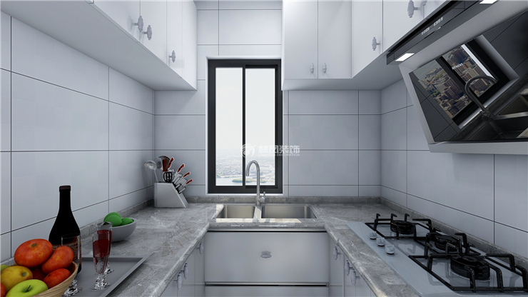 新湖青藍國際104平3居室現(xiàn)代風格林鳳裝飾的廚房因為餐廳的區(qū)域與廚房距離相連緊密沒有太大的空間所以廚房的門采用了推拉門極大的提高了進出廚房的空間,墻磚選的是與地面灰白色瓷磚相近的白色的瓷磚,灰色的地磚白色的墻磚搭配的使整個空間不會太昏暗,U型的白色櫥柜使廚房更顯得寬敞明亮。