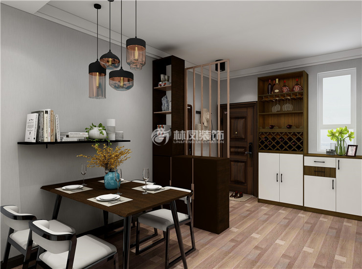 中海和平之門114平3居室現(xiàn)代風(fēng)格林鳳裝飾的餐廳和廚房是連接在一起的,打破了傳統(tǒng)的廚餐模式。