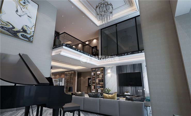 御景新世界360平3居室現(xiàn)代輕奢風(fēng)格林鳳裝飾的客廳以黑白灰為主調(diào),搭配一些金屬元素的配飾,沙發(fā)選用了淺灰色布藝沙發(fā),在追求奢華的同時又不失低調(diào),整體效果十分高級。保留了挑空,使空間更加大方。