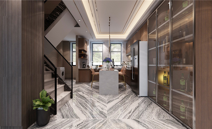 御景新世界360平3居室現(xiàn)代輕奢風(fēng)格林鳳裝飾的餐廳與廚房連在一起,倒臺代替了普通的四人餐桌,現(xiàn)代氣息濃厚。棚面加入了一些金屬線條,增強了奢華感。