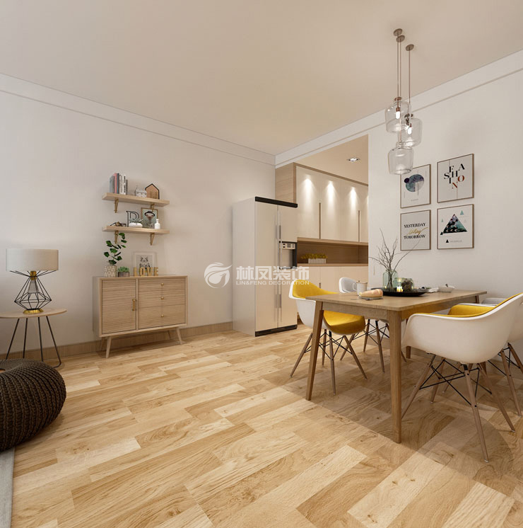 遠洋大河宸章89m2兩室兩廳北歐風格林鳳裝飾的餐廳空間,但是餐廳空間比較小,因此在墻角處的位置坐了一小酒柜,酒柜置物柜顏色與家具呼應,讓主人用餐更加方便和增加了儲物功能!