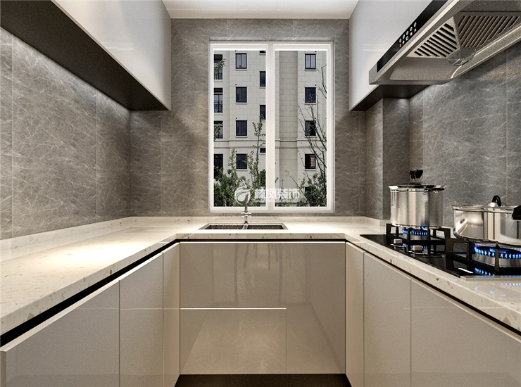 中??党?9平兩室兩廳現(xiàn)代風(fēng)格林鳳裝飾的廚房選用白色櫥柜與灰色墻磚的結(jié)合,既簡(jiǎn)潔有明朗,處處彰顯著志高的生活品質(zhì).