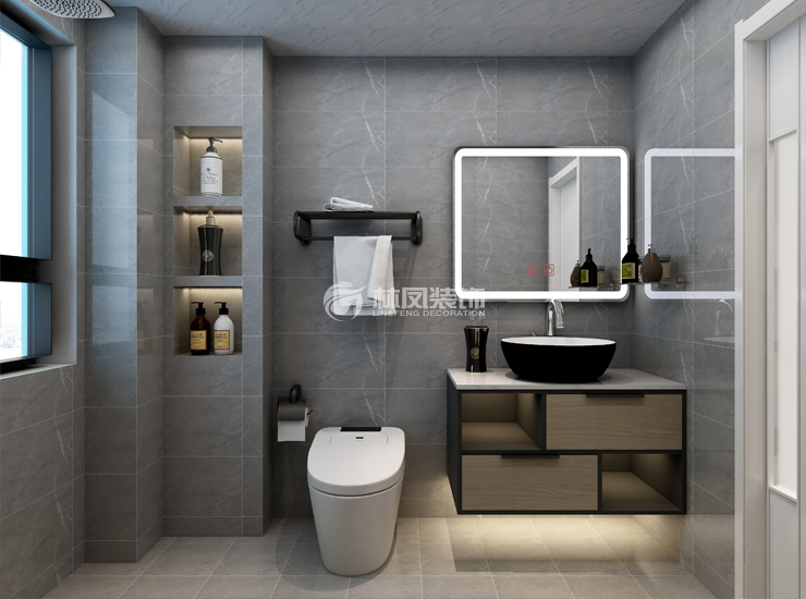 府城名著114平兩室兩廳現(xiàn)代輕奢風(fēng)格林鳳裝飾的衛(wèi)生間拋除傳統(tǒng)意義的衛(wèi)生間感覺,舍棄了傳統(tǒng)的明亮與庸俗,深灰色地磚上墻的墻面質(zhì)感與火燒板石材臺面給人一種回歸自然深處的感覺,整個墻面以深色為主,照明做成了嵌入隱藏式設(shè)計,整個空間不見光來卻與光相隨。