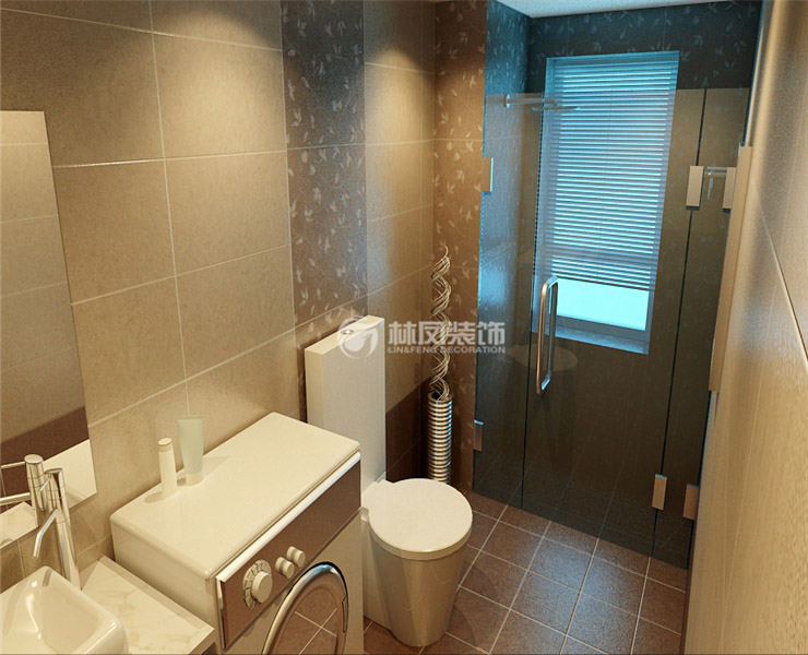 陽光100國際新城156平三室兩廳新中式風格林鳳裝飾的衛(wèi)生間空間并不算太大。所以在瓷磚的選擇上選擇了中色調(diào)的墻磚深淺色的搭配。為了使淋浴區(qū)更加干凈整潔做了浴屏的設(shè)計。
