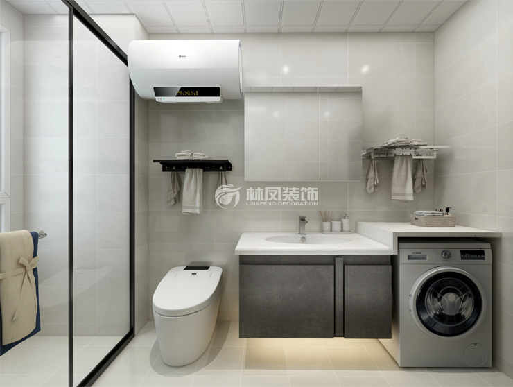 綠城全運(yùn)村玉蘭花園128平三室兩廳現(xiàn)代簡約風(fēng)格林鳳裝飾的主衛(wèi)瓷磚為上下版,增加層次感。跳色的浴室柜打破固有的灰色體系。坐便右側(cè)的空間比較狹小,選用浴簾代替浴屏,節(jié)省了空間。