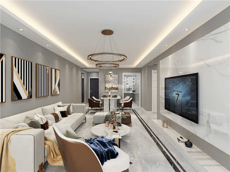 客廳造型采用直線的設(shè)計(jì),大方,使整體房間更有空間感。背景墻采用天然紋理合成大理石,既使背景墻出天然紋理的效果,又為年輕小兩口節(jié)省開銷。地磚波打線的使用在空間感上和棚面的直線吊棚天地相接。