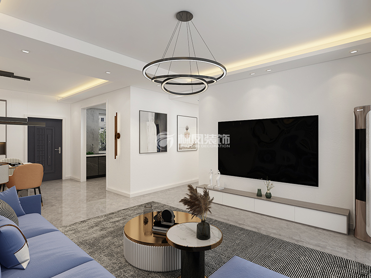 客廳整體色調(diào)黑白為主,藍(lán)色沙發(fā)與主色調(diào)形成對(duì)比,簡(jiǎn)潔大方,搭配暖色燈給人以家的溫馨之感。