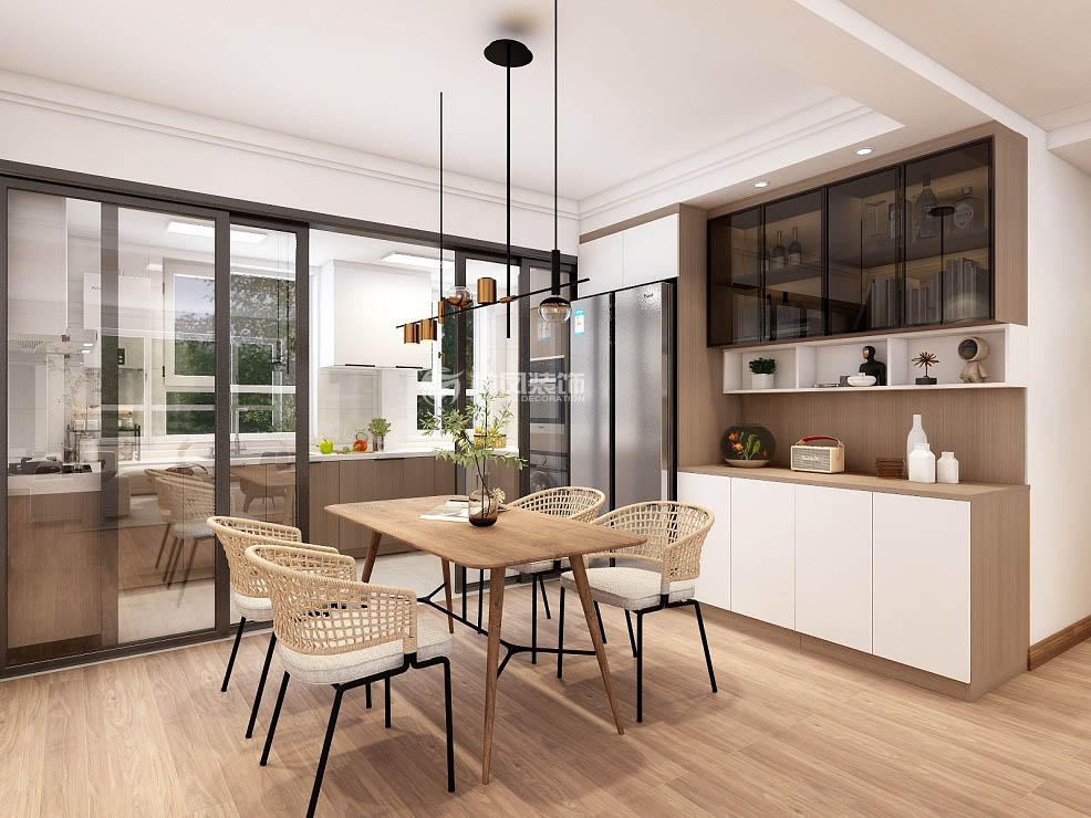 餐桌直接在廚房門口,縮短了端菜的距離,另外,餐桌后邊就是餐邊柜,餐邊柜的背面是木色背板,視覺上會使得整個空間很有層次感。