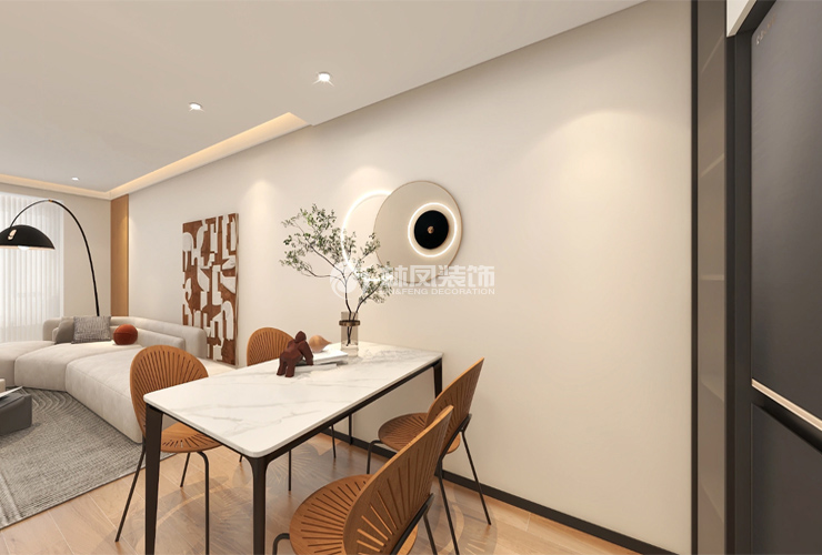 餐廳說明:簡約的餐桌搭配木色系餐椅,跳脫又清新,無主燈的設(shè)計增加線條感,使得餐廳在柔和的燈光下營造更加溫馨的氛圍。