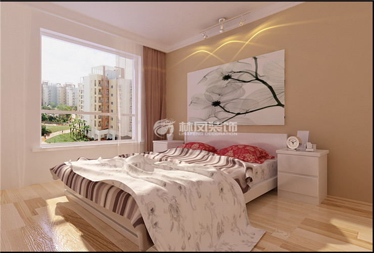 主臥室整體為暖色系,射燈的設(shè)計,現(xiàn)代感十足。實木復(fù)合地板更加提高檔次。床的后背一整面墻涂刷硅藻泥,床后背上方掛一副裝飾畫,使得整個臥室色彩更加豐富且溫馨。