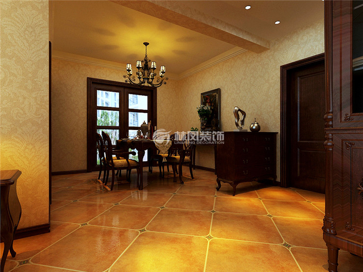 餐廳和客廳在不同的空間里,沒有過多的裝飾吊棚,而是使用特殊定制的工藝石膏線,在整體家具和裝飾材料的統(tǒng)一.起到了整體呼應(yīng)的作用.過廊的設(shè)計(jì)采用的是美式石膏板假梁,使空間與空間的過度不是那么的突兀.