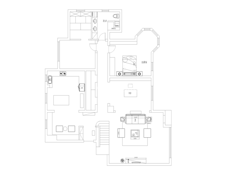 床頭造型和橋拱形設(shè)計(jì)使空間更加連貫,簡單的石膏板頂棚設(shè)計(jì)與粗狂拼花地板強(qiáng)烈的視覺反差,使空間更加具有張力。